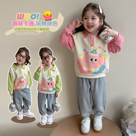 阿不童装&拼色小猫印花套装