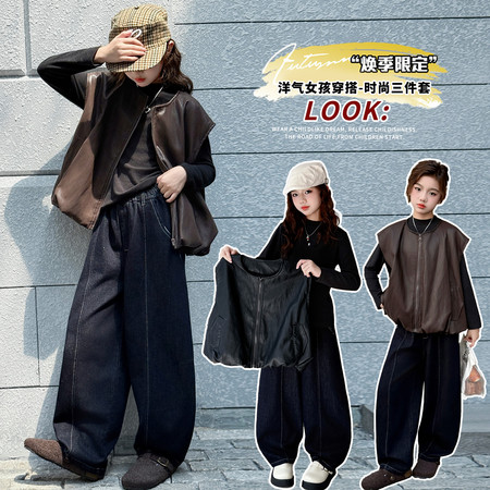 巴啦小妞&2569皮马甲打底弯刀牛仔裤三件套